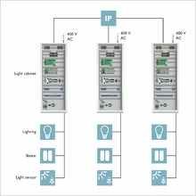 -Light control cabinet for hall lighting with 6 DALI masters (can be extended to 8), power measurement, fuse monitoring, and 2x 10/100 Ethernet (can be extended via the network). Can be incorporated into control systems, comprehensive range of functions can be parameterized via a browser.